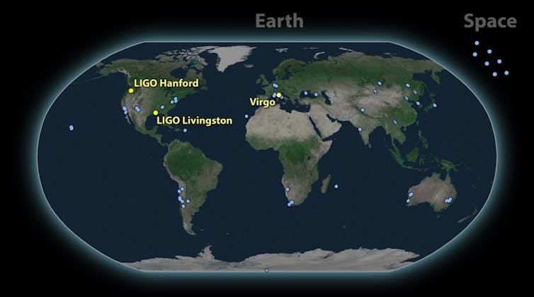 Carte du monde résumant la campagne d’observation du suivi des ondes gravitationnelles détectées le 17 août 2017 menées par les groupes d’astronomes partenaires de la collaboration LIGO/Virgo. (LIGO/Virgo, CC BY)
