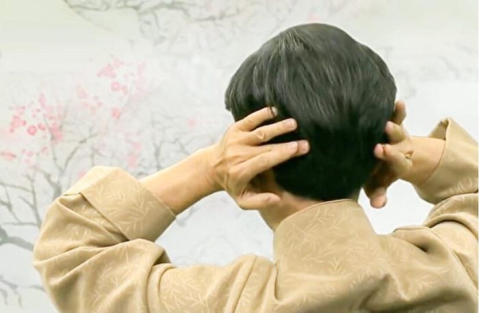 Posez les paumes sur les oreilles et placez les doigts (index, majeur, annulaire et auriculaire) à l’horizontale sur l’arrière de la tête, les majeurs se faisant face. Pliez ensuite les index sur les majeurs et laissez-les glisser pour frapper fermement l’occiput : vous entendrez alors un son clair, semblable à un battement de tambour.