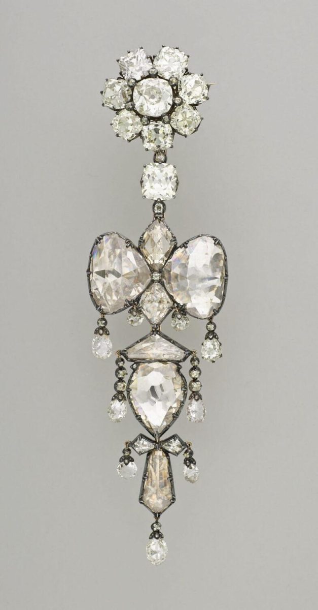 La broche-reliquaire d’Eugénie fut l’un des rares joyaux de la Couronne à ne pas être mis aux enchères par la Troisième République. Elle intégra directement les collections du Louvre. Son nom est impropre : la pièce ne comporte aucun espace permettant d’abriter une relique. Des spécialistes avancent l’idée que son écrin aurait pu être destiné à cet usage. La broche fut réalisée en 1855 par Alfred Bapst, issu d’une lignée de joailliers royaux. Sous la rosette qui orne son sommet se trouvent deux gros diamants, évoquant chacun la forme d’un cœur. Ces pierres majeures remontent au cardinal Jules Mazarin. Principal ministre de France, Mazarin constitua au milieu du XVIIᵉ siècle une collection légendaire composée de 18 diamants rares. À sa mort, il les légua au roi Louis XIV et aux joyaux de la Couronne française. Les diamants numéros 17 et 18 furent utilisés par le souverain comme boutons de manteau et, des siècles plus tard, réemployés pour la broche d’Eugénie.