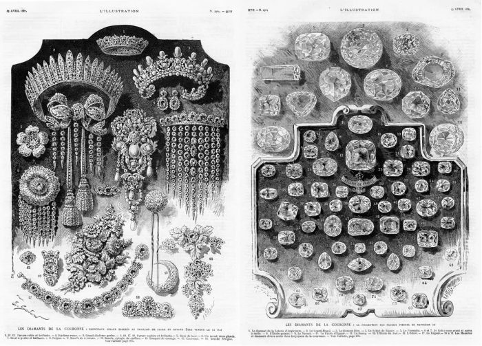 Les bijoux dérobés sont un collier et des boucles d’oreilles en émeraude faisant partie d’un ensemble assorti ayant appartenu à l’impératrice Marie-Louise ; un diadème, un collier et une boucle d’oreille unique en saphir provenant de la parure de la reine Marie-Amélie et de la reine Hortense ; ainsi que le nœud-broche, le diadème et la broche-reliquaire de l’impératrice Eugénie.