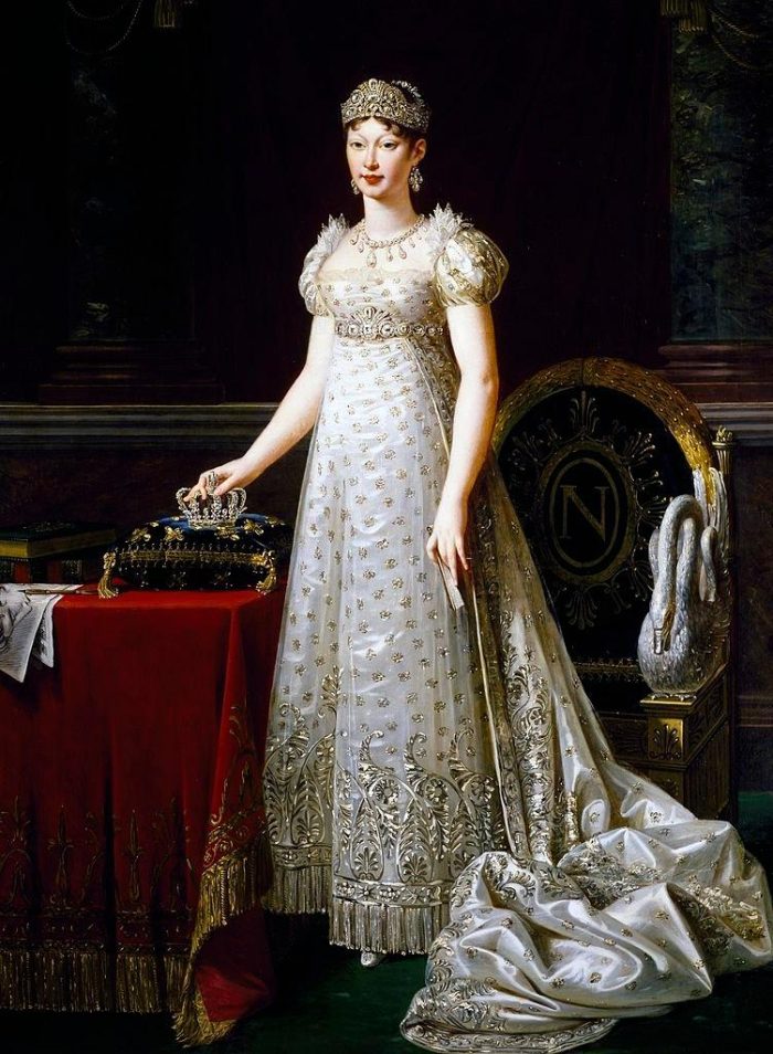 Marie-Louise (1791–1847), fille de l’empereur du Saint-Empire romain germanique et arrière-petite-nièce de la reine Marie-Antoinette, devint en 1810 la seconde épouse de l’empereur Napoléon. En tant qu’impératrice, elle avait besoin de bijoux d’exception pour être à la hauteur de son nouveau rang. Napoléon commanda, avant et après le mariage, de somptueux ensembles de bijoux – appelés parures – au joaillier français François-Régnault Nitot. (Sa maison deviendra plus tard Chaumet, aujourd’hui encore l’une des plus prestigieuses maisons de joaillerie parisiennes.) Certains de ces ensembles étaient destinés à la collection personnelle de Marie-Louise, tandis que d’autres furent désignés comme joyaux de la Couronne.