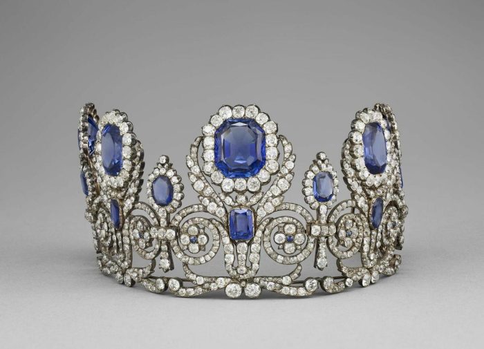 Diadème de la parure de la reine Marie-Amélie et de la reine Hortense, début du XIXᵉ siècle. Diamants et saphirs de Ceylan ; env. 6,2 cm sur 10,7 cm. (Stéphane Maréchalle/Musée du Louvre)