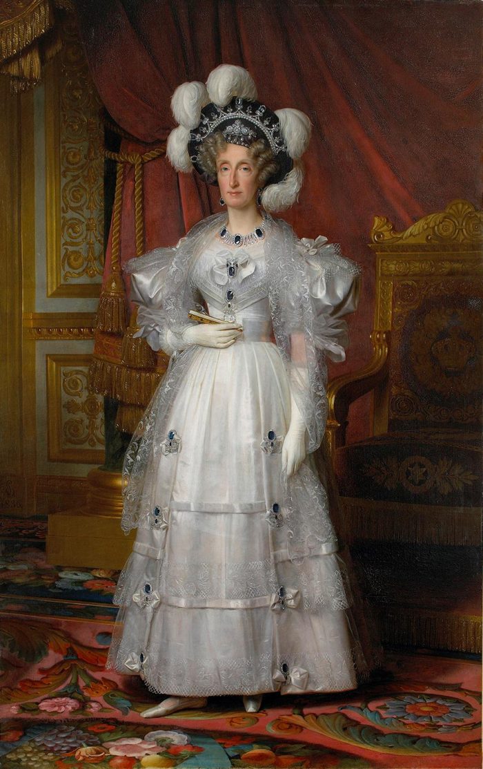 Un portrait de Marie-Amélie de Bourbon, reine des Français, 1836, par Louis Hersent. Huile sur toile ; env. 225 cm sur 158 cm. Château de Versailles, France. (Domaine public)