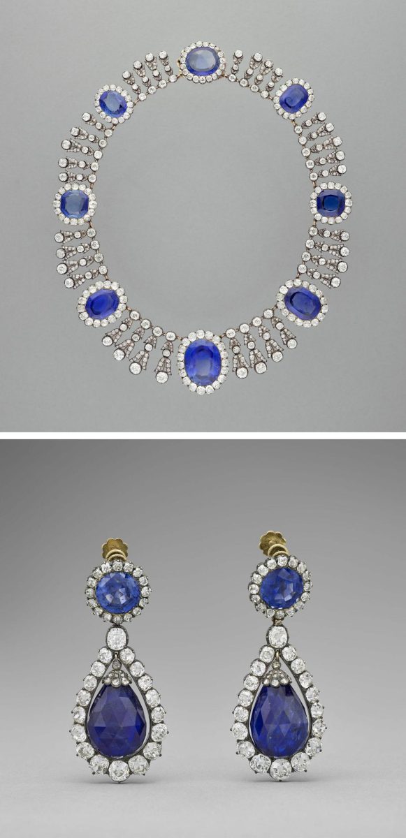 Collier et boucles d’oreilles de la parure de la reine Marie-Amélie et de la reine Hortense, début du XIXᵉ siècle. Diamants et saphirs de Ceylan ; collier mesurant env. 3,3 cm sur 40 cm et boucles d’oreilles env. 5,1 cm sur 2,3 cm. (Stéphane Maréchalle/Musée du Louvre)