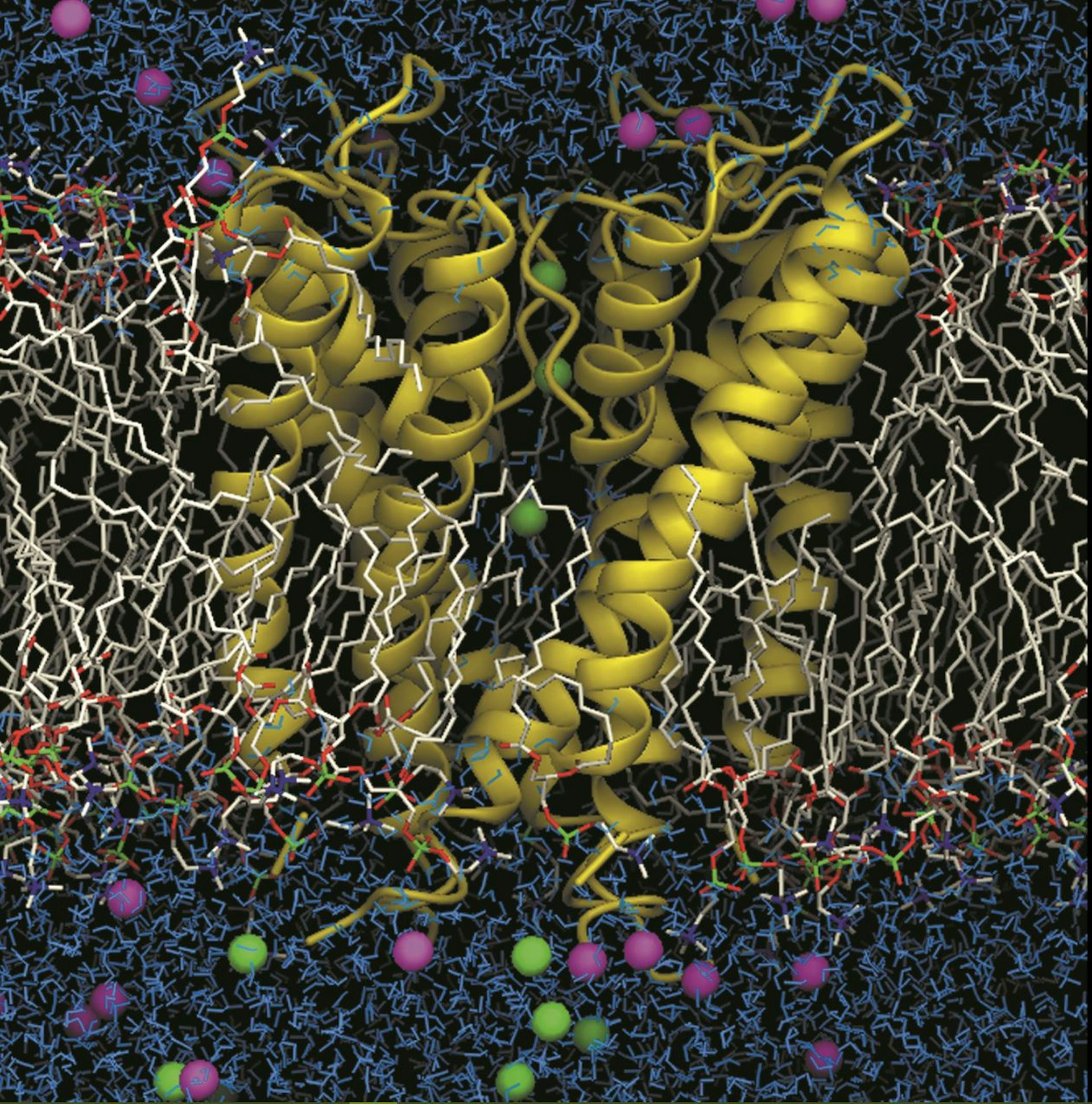 Mon labo comprend une vingtaine de personnes dont quatre ou cinq sont impliqués dans des travaux expérimentaux. Les trois-quarts du labo travaillent exclusivement avec des méthodes théoriques. Entre autre, la méthode appelée « dynamique moléculaire » est centrale à notre travail. Cette méthode consiste à créer un modèle atomique d’un système ainsi que des forces microscopiques, et à propager la trajectoire des atomes à partir de l’équation classique de Newton, « F=MA ». Cette trajectoire numérique – une approximation de la réalité – est un outil puissant pour aider à comprendre comment les mouvements dynamiques des atomes influencent la fonction des macromolécules biologiques (ADN, ARN et protéines). Les principaux objets que nous étudions sont les canaux ioniques et les kinases.