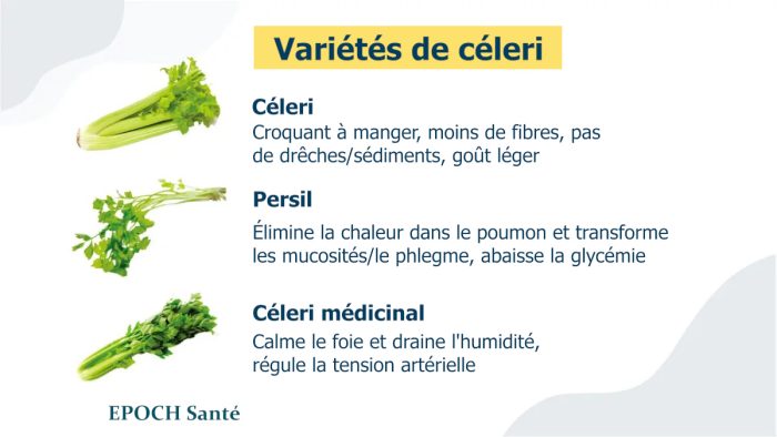 Selon le Dr Liu, le céleri peut être classé en trois catégories : le céleri, le persil et le céleri médicinal. Le céleri, à la texture croquante, est généralement utilisé dans les plats ou les salades. Le persil est souvent employé pour dissiper la chaleur pulmonaire et les mucosités : en consommer lors d’un rhume favorise la transpiration. Le céleri utilisé en médecine chinoise est principalement le céleri médicinal.