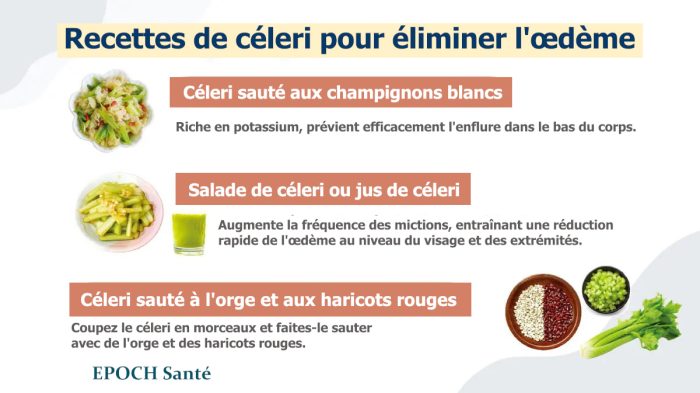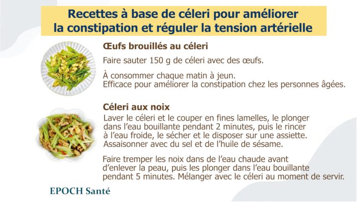 Le Dr Liu propose plusieurs recettes à base de céleri pour aider à soulager l’œdème, faire baisser la tension artérielle et traiter la constipation.