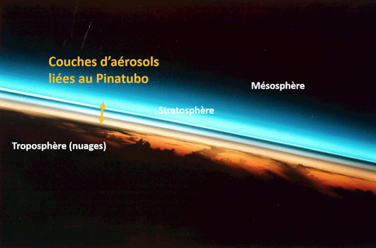 Photographie prise par les astronautes à bord de la navette Atlantis : vue de l’atmosphère terrestre au coucher du soleil, le 8 août 1991 ; soit huit semaines après l’éruption du volcan Pinatubo (Philippines). On distingue deux couches d’aérosols situées à une altitude entre 20 et 25 kilomètres. (Image NASA STS043-22-23)