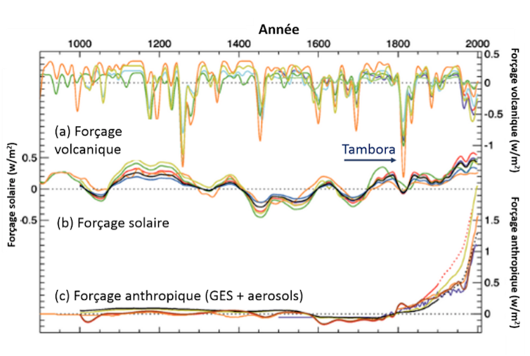 Reconstructions des forçages radiatifs en moyenne globale depuis l’an 1000 en W/m² pour [a] l’activité volcanique ; [b] l’activité solaire ; [c] tous les autres forçages incluant les gaz à effet de serre et les aérosols troposphériques sulfatés. Les différentes couleurs correspondent à différents modèles simulant le passé. Adapté du rapport du GIEC (2007). (Author provided)