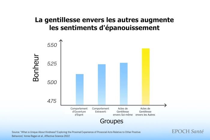 En termes de « eudaimonia » — ce sentiment profond de sens et d’accomplissement —, aider les autres surpassait toutes les autres activités. Si le soin de soi, les relations sociales ou la culture suscitaient des émotions positives, rien n’égalait la chaleur intérieure éprouvée par ceux qui faisaient preuve de bonté.