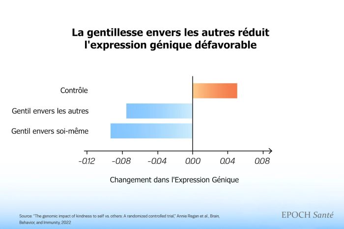 Les résultats furent étonnants : le groupe ayant accompli des actes de gentillesse envers autrui montrait les changements les plus favorables dans l’activité des gènes immunitaires. Les analyses sanguines révélaient une baisse de l’expression des gènes associés à l’inflammation et au stress.