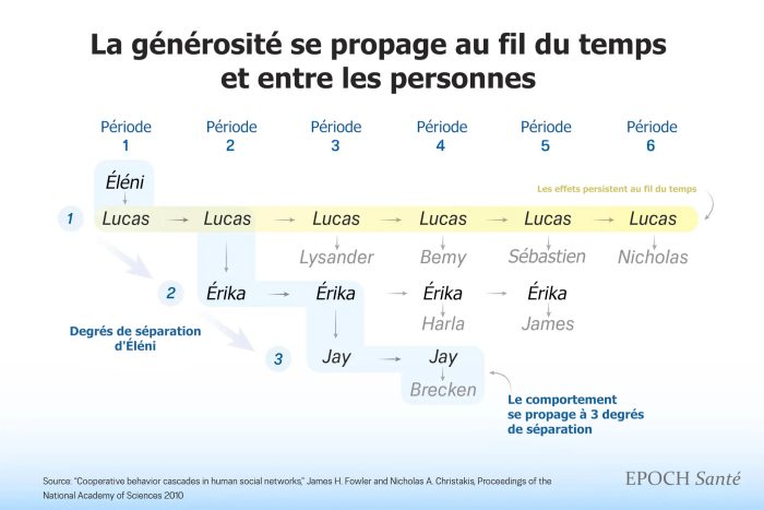 Les chercheurs James Fowler et Nicholas Christakis ont démontré dans Proceedings of the National Academy of Sciences que la générosité se propage à travers les réseaux sociaux jusqu’à trois degrés de séparation : lorsqu’une personne agit avec altruisme, elle inspire ses amis, puis les amis de ses amis, créant une véritable chaîne de bonté.