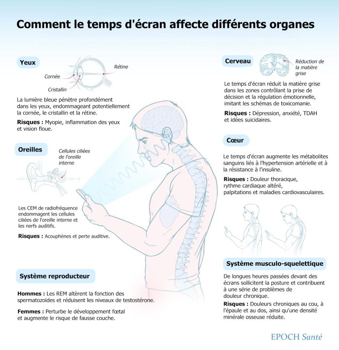 L’Américain moyen saisit son téléphone 144 fois par jour. De plus en plus de données scientifiques montrent qu’un excès de temps d’écran affecte presque toutes les parties du corps, à commencer par les yeux, le cœur et la colonne vertébrale.