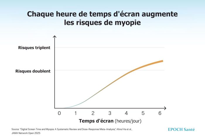 Une revue systématique portant sur plus de 335.000 participants a révélé qu’une heure supplémentaire de temps d’écran par jour augmentait de 21 % la probabilité de développer une myopie.