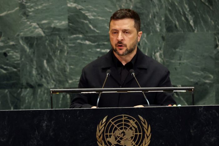 Le président ukrainien Volodymyr Zelensky, lors de l’Assemblée générale des Nations Unies à New York, le 24 septembre 2025. (Spencer Platt/Getty Images)