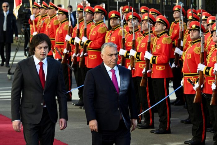 Le Premier ministre géorgien Irakli Kobakhidze (à g.) et le Premier ministre hongrois Viktor Orban (à d.) lors d’une cérémonie officielle à Tbilissi, le 29 octobre 2024. (Vano Shilmov/AFP via Getty Images)