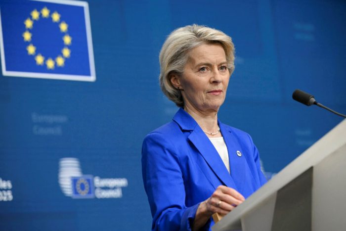 La présidente de la Commission européenne Ursula von der Leyen s’exprime à Bruxelles le 23 octobre 2025. (Nicolas Tucat/AFP via Getty Images)