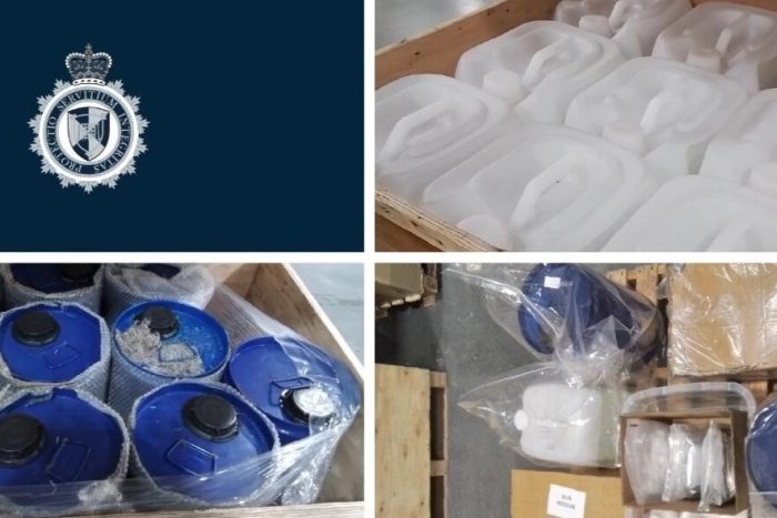 En mai, les agents de l’Agence des services frontaliers du Canada ont saisi 4300 litres de précurseurs chimiques au centre d’examen des contenants de Tsawwassen, en Colombie-Britannique. (Photo fournie par l’ASFC)