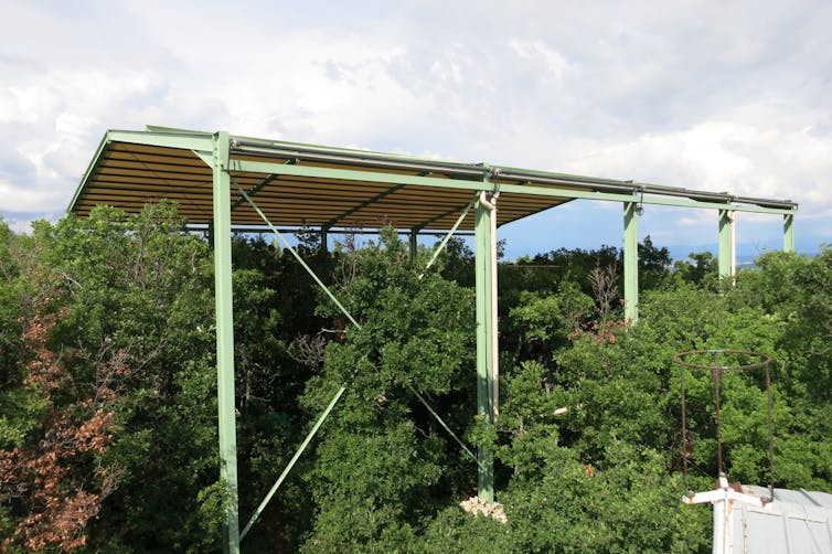 - Un système original d’exclusion de pluie couvrant environ la moitié de la parcelle (300 m2) constitué de bâches déroulantes interceptant les précipitations à la demande. Les précipitations sont volontairement interceptées uniquement sur la période printanière et estivale ; ceci permet de reconstituer un régime des pluies proche de celui que nous prédisent les modèles, tablant sur une baisse de ces précipitations (de l’ordre de 30 à 40 %), concentrée sur la période chaude.