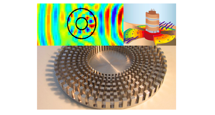 Prototype de cape pour les ondes sismiques : un métamatériau de 20 cm de diamètre constitué de plots en aluminium de 1cm de haut organisés en couches concentriques a été testé avec succès pour les vagues ([8-15 Hz]), les ondes sonores ([3-7 kHz] et les micro-ondes ([3-7 GHz] ; la carte de champ expérimentale (en haut à gauche) pour le champ magnétique montre l’absence de champ au centre de la cape, qui pourrait conduire théoriquement jusqu’à un dispositif de protection sismique à plus grande échelle (infographie CNRS, en haut à droite). (S. Enoch/R. Abdeddaim/Institut Fresnel/CC BY)