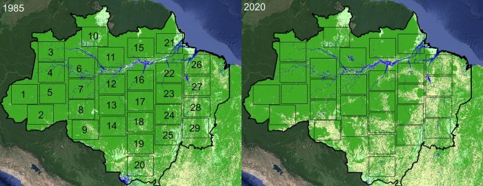 Répartition spatiale des zones forestières (en vert) et non forestières (en beige) dans la région amazonienne brésilienne en 1985 (à gauche) et en 2020 (à droite). Les carrés noirs indiquent les zones dans lesquelles les chercheurs ont étudié les effets météorologiques de la déforestation.