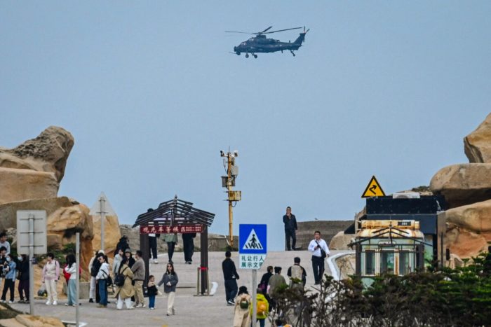 Un hélicoptère militaire chinois survole des touristes sur un belvédère dominant le détroit de Taïwan, sur l’île de Pingtan, point le plus proche de Taïwan, dans la province du Fujian, le 7 avril 2023. (Greg Baker/AFP via Getty Images)