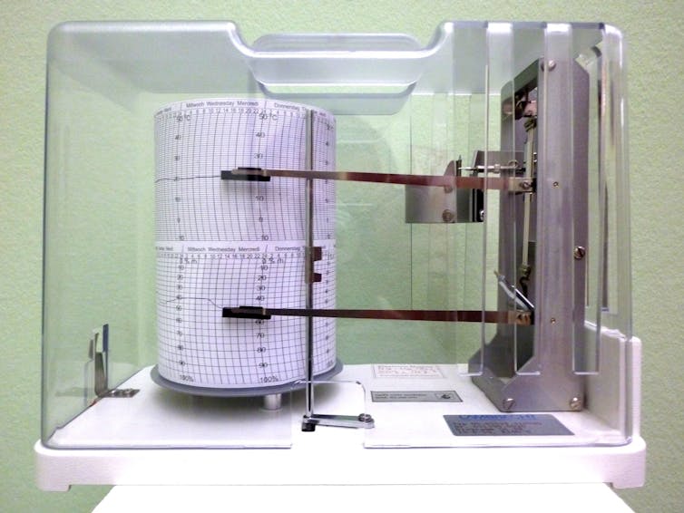 Le principe de base du sismomètre : l’enregistrement du mouvement d’une masse accrochée à un ressort retranscrit comment les ondes sismiques font vibrer le sol. (Nicolas/Flickr, CC BY)